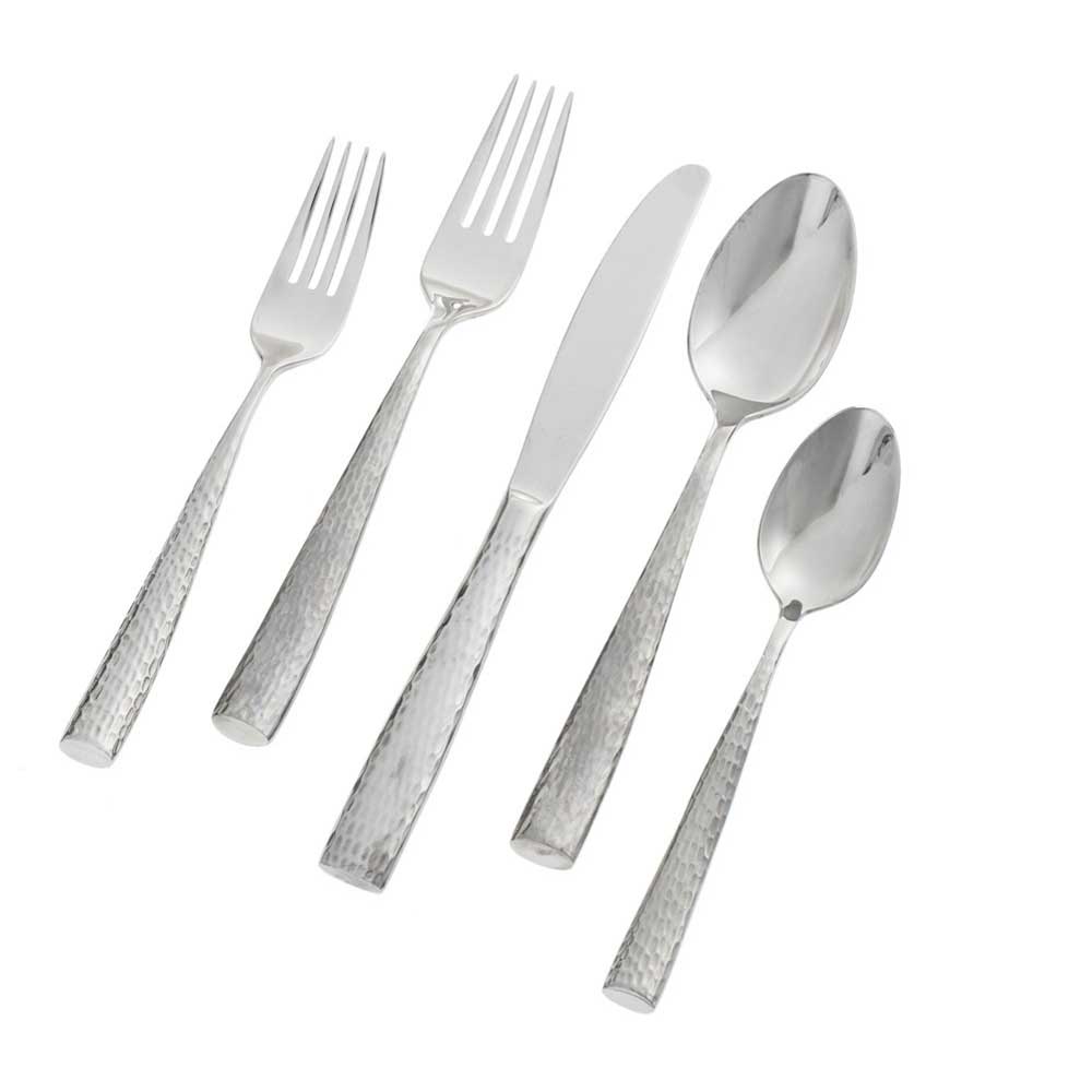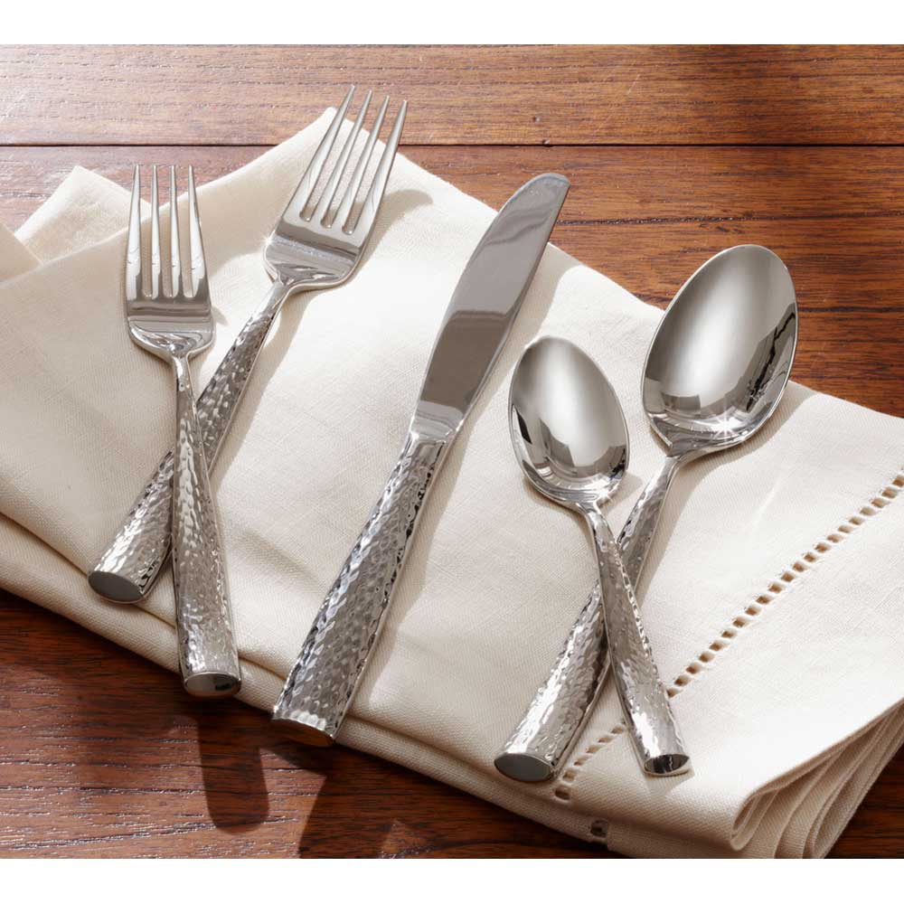 The subtle hammered texture mimics nature's patterns, bringing organic beauty to your dining table. This textured surface provides practical benefits including better grip and concealment of minor wear. The hammered finish gives each piece unique character while maintaining functional excellence.