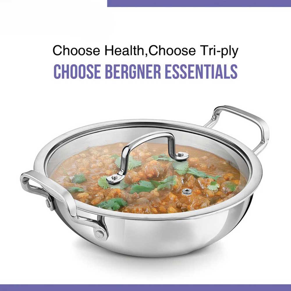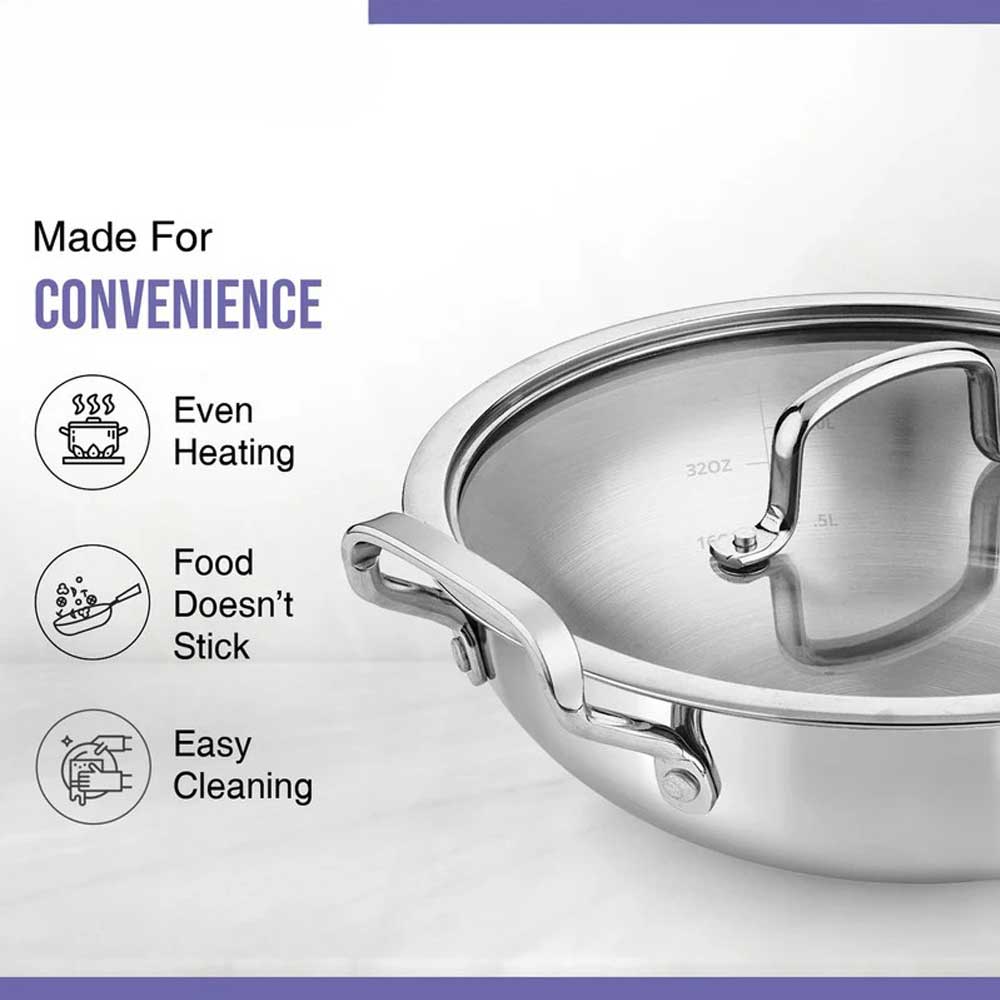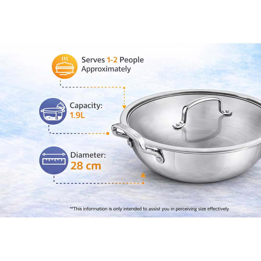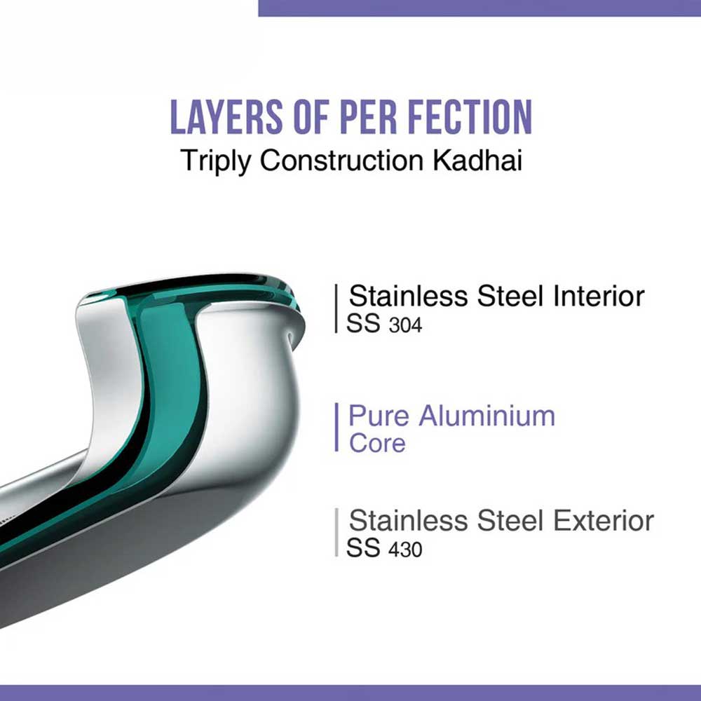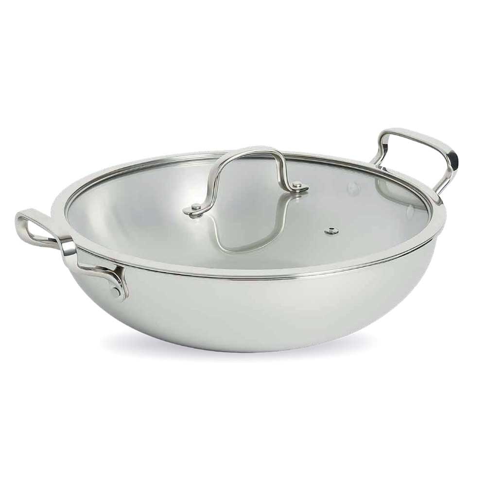 Perfect stir-frying with our Triply Wok, combining traditional shape with advanced heat distribution. The three-layer construction ensures even cooking and excellent heat retention. Premium quality supports extensive wok cooking through years of use.
